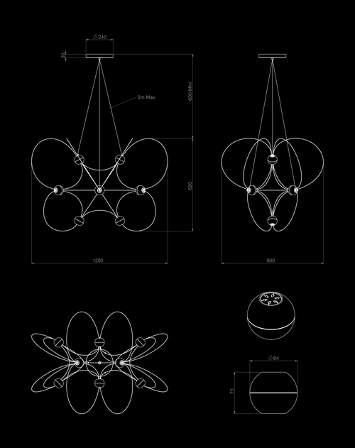 Pendant lamp with 10 light sources, black metal rods, and integrated LED spheres. Between sculpture and luminaire, Munari navigates with lightness and elegance. A logical balance formed by the spheres and rods, creating a poetic structure that evokes, for some, magnetic field lines or a constellation of planets.