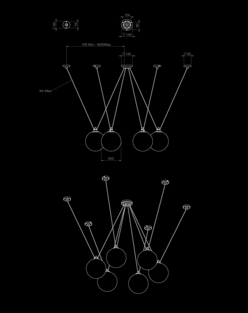Pendant lamps in cast aluminium and textile cables. Les Acrobates de Gras perform various figures in the air, perched at a height of several metres.