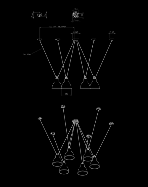 Pendant lamps in cast aluminium and textile cables. Les Acrobates de Gras perform various figures in the air, perched at a height of several metres. The spectacle is bold: in movement, rhythm and colour. The colours and shapes of the Gras reflectors and glass balls (sizes L, XL, Ø175 and Ø250) offer a dynamic and elegant display. Les Acrobates de Gras can be linked together.