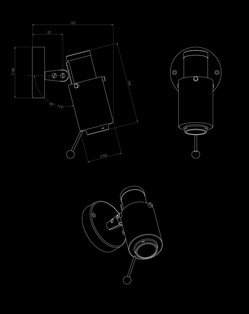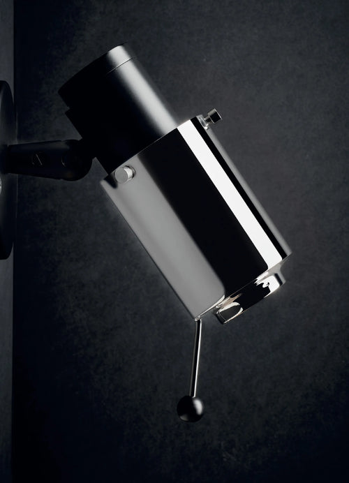 Wall lamp in steel and aluminium, with or without switch. Biny in a few words: efficiency, simplicity, sobriety and elegance. This spotlight straight out of the world of Jules Verne allows 330° rotation and 88° tilt in order to direct and focus the beam on a specific area, to read without disturbing your neighbour.
