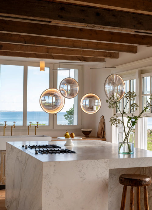 Chandelier composed of 4 luminous discs, hanged by a matt black structure. But what if the planets were nothing more than soap bubbles that have remained intact as they travel through time?