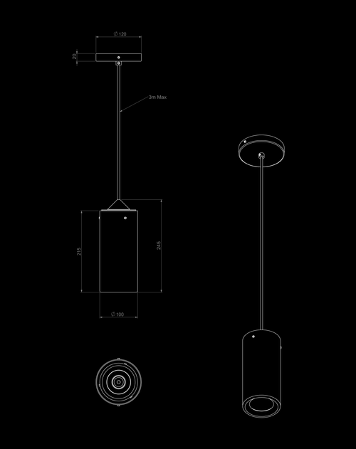 Tubular suspension in porcelain, glossy white finish. This pendant light measures 21,5 cm in height and has a diameter of 10 cm. The suspension cable extends up to 5 meters. IP44 certified, it can be installed on the ceiling o...