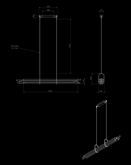 Pour forger sa patte esthétique, Sebastian Summa a imaginé, afin de le suspendre au plafond, une paire de potences semblables à des agrès de gymnastique, et calculées pour équilibrer parfaitement le faisceau de tubes. Cet accastillage fixe ajoute à l’ensemble une touche athlétique post-industrielle, et signe un tour de force évidemment artisanal. D'une longueur minimale de 1,30 mètre, pesant 7,6 kilos, la suspension NL12 est composée de douze tubes en verre non-fixes, que l'on peut ainsi positionner en les glissant selon l'envie afin de créer des décalages, ou au contraires en les alignant parfaitement les uns aux autres. Structure d'accroche proposée en finition noire (potences hautes de 70 cm), NL12 est équipé d’une source LED intégrée (2700K).